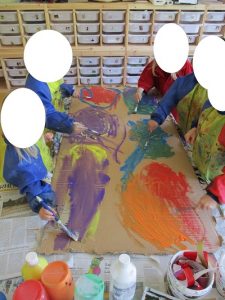 Plötzlich hatten wir zwei XXL Leinwände. Daraus ist gemeinsam die Idee entstanden ein großes Kunstwerk zu machen. Immer sechs Kinder konnten gleichzeitig an dem großen Bild arbeiten.