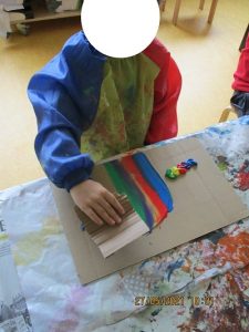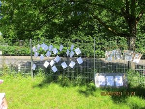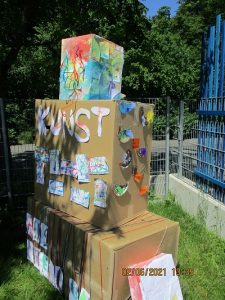 Wir habe kleine, große und ganz große Kartons beklebt, umwickelt und bemalt. Viele Pappschatzkästchen verziert. Wir haben kunterbunte Murmelbilder aufgeklebt. Ein fröhlich bunter Vogelschwarm war auf dem mittelgroßen Karton gelandet und wir haben Tapetenbilder mit Wäscheklammer am Zaun aufgehängt. Ein Krikelkrakelkreis-Girlande war ebenfalls am Zaun befestigt und tanzte fröhlich im Wind. Ein besonderes Highlight waren die selbst gestalteten Bücher der Kinder. Es sind farbenfrohe Bilder und phantastische Geschichten entstanden. Sie wurden am Tag vor der Ausstellung in einer Kinderpressekonferenz den anderen Kindern vorgestellt.