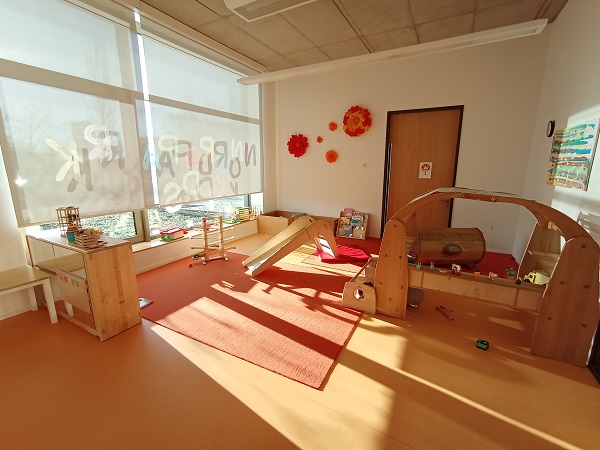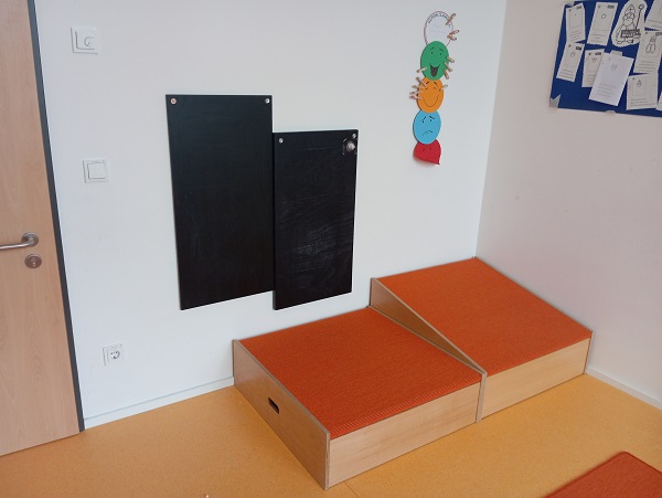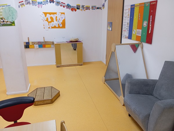 In unserem großzügigen Flur befinden sich mehrere Spielbereiche, die bei Bedarf verändert werden. Tische an denen Gesellschaftsspiele gespielt werden, eine Leseecke, eine Spiegelpyramide,