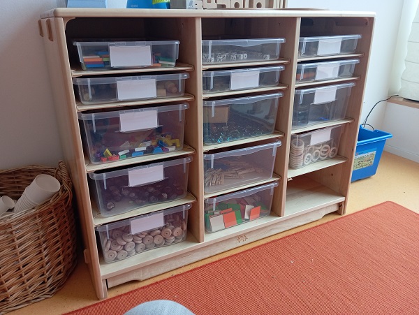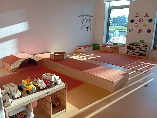 Die Baumeister finden in diesem Raum verschiedene Materialien wie z.B Holzklötze, Legosteine, Duplosteine, Belebungsmaterial wie Menschen und Tiere aus Holz, Autos……… die dazu einladen zu planen, zu bauen und Rollenspiele zu verfallen.
