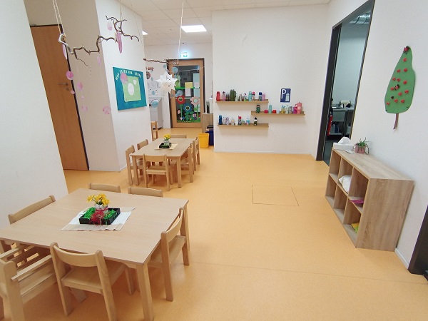 Dort wird morgens das Frühstücksbüffet für alle Kinder bereitgestellt. Nach dem Frühstück, kann der Raum individuell genutzt werden.