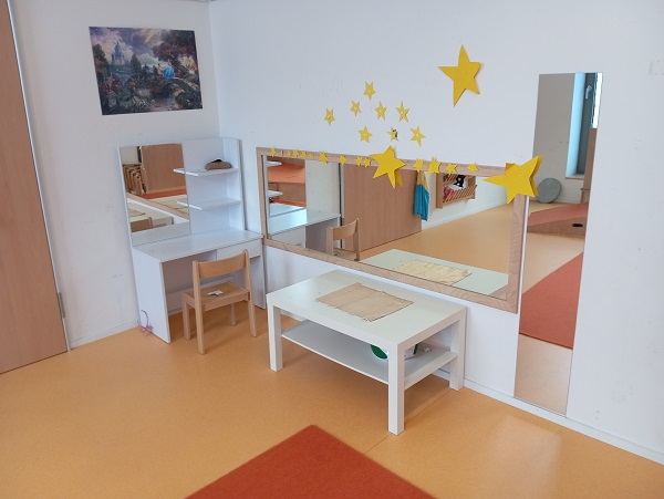 Es befinden sich dort unterschiedliche Requisiten, damit die Kinder in verschiedene Rollen schlüpfen können. Die Bühne, ein Schminktisch und der große Spiegel geben den Kindern die Möglichkeiten einen Fuß in die Welt des großen Theaters zu setzen.